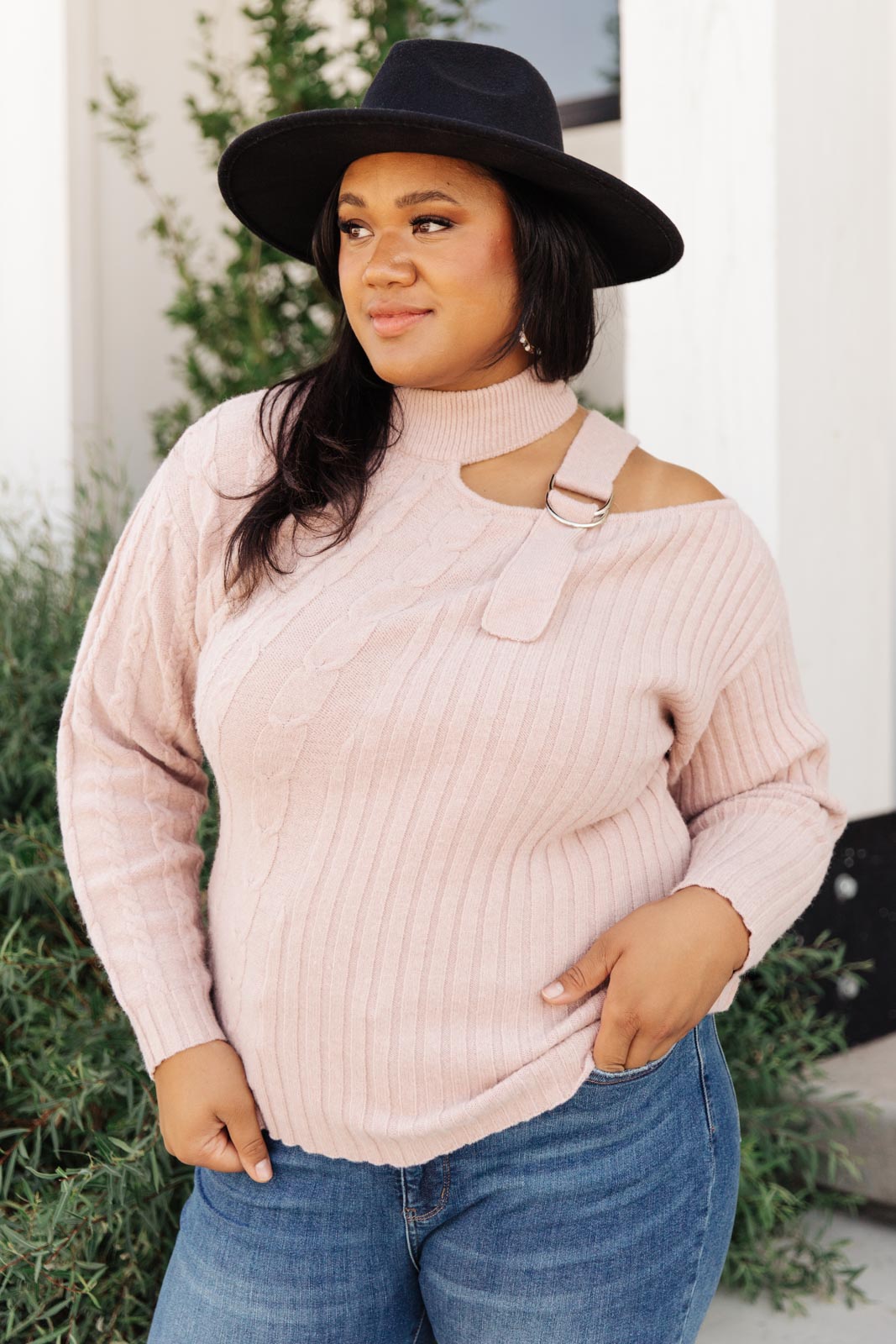 It's hard to choose our favorite thing about the unique City Chic Sweater! This soft knit sweater features a mock neck and shoulder cut out that is held together by an adjustable strap. This sweater is a perfect day-to-night statement piece!